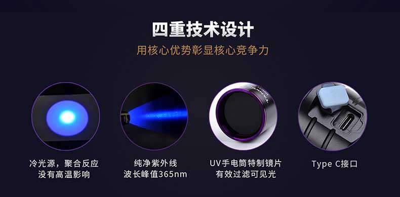 | 【產(chǎn)品特色】 1.日本原裝進(jìn)口的日亞 UV LED,使用18650鋰電池鋰供電 2.輸出紫外線強(qiáng)度:>72000μW/cm2(距離15cm),>30000μW/cm2(距離38 厘米) 3.UV手電筒特制鏡片,有效過濾可見光,降低可見光干擾 4.支持DC 5V直充,充電口為Type C接口, 5.帶三色指示燈:充電紅燈,充滿綠燈,工作藍(lán)燈,有效提示各個(gè)狀態(tài) | |||
