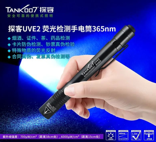 UVE2是一款便攜式筆帽式熒光檢測手電筒,峰值波長為365nm,能夠激發熒光反應的范圍更加廣泛。